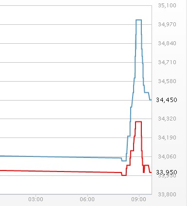 Duy trì mức đỉnh trong hơn 15 phút, DOJI lại nhanh chóng giảm giá giao dịch. Đến 9h30 phút, giá mua bán tại đơn vị này còn 33,95-34,45 triệu đồng một lượng.