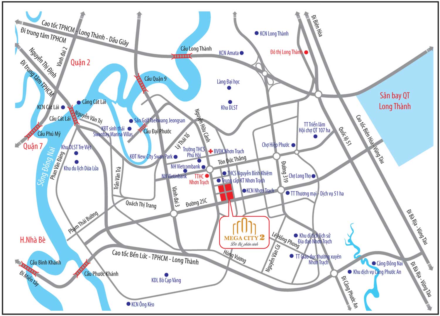 Tọa lạc ngay mặt tiền đường 25C Nguyễn Ái Quốc, Nhơn Trạch, tỉnh Đồng Nai. Theo định hướng trở thành “đô thị hạt nhân” của thành phố Nhơn Trạch, dự án khu đô thị Mega City 2 hứa hẹn sẽ là nơi mang lại cuộc sống thịnh vượng và cơ hội đầu tư hấp dẫn nhất cho khách hàng.
