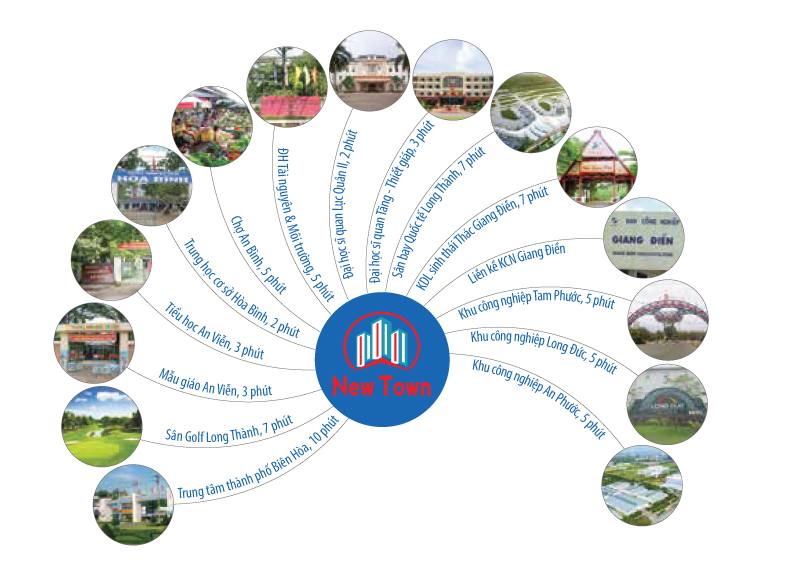 Khu dân cư New Town được quy hoạch hiện đại, đáp ứng tối đa nhu cầu an cư của cư dân với hệ thống tiện ích nội khu gồm khu thương mại - dịch vụ, trường học, công viên, khu thể dục thể thao... Bên cạnh đó, từ New Town còn dễ dàng tiếp cận các tiện ích liên kết đa dạng như UBND xã An Viễn; sân bay quốc tế Long Thành; các khu công nghiệp Giang Điền, An Phước, Long Đức, Tam Phước; chợ An Bình; các trường Đại học Tài nguyên Môi trường, Đại học Sỹ quan Lục quân 2, Đại học Tăng Thiết Giáp; trường mẫu giáo An Viễn; trường Tiểu học An Viễn; trường THCS Hòa Bình; khu du lịch sinh thái Thác Giang Điền, sân golf Long Thành… Tất cả đảm bảo cho cư dân một cuộc sống tiện nghi, thuận tiện trong sinh hoạt, công việc hàng ngày.