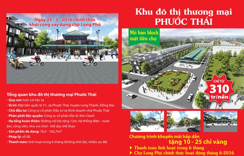 Tại thời điểm này, khu đô thị thương mại Phước Thái được xem là dự án hấp dẫn bậc nhất trong khu vực dành cho các nhà đầu tư lẫn những người đang tìm một không gian sống nhiều tiện ích và giao thông thuận lợi. Bởi ngay giữa dự án là chợ mới Long Phú quy mô 4.000 m2 đang xây dựng nhằm đáp ứng mọi nhu cầu mua sắm, sử dụng dịch vụ của người dân trong khu vực. Dự kiến, chợ Long Phú sẽ chính thức hoạt động từ tháng 6-2016.