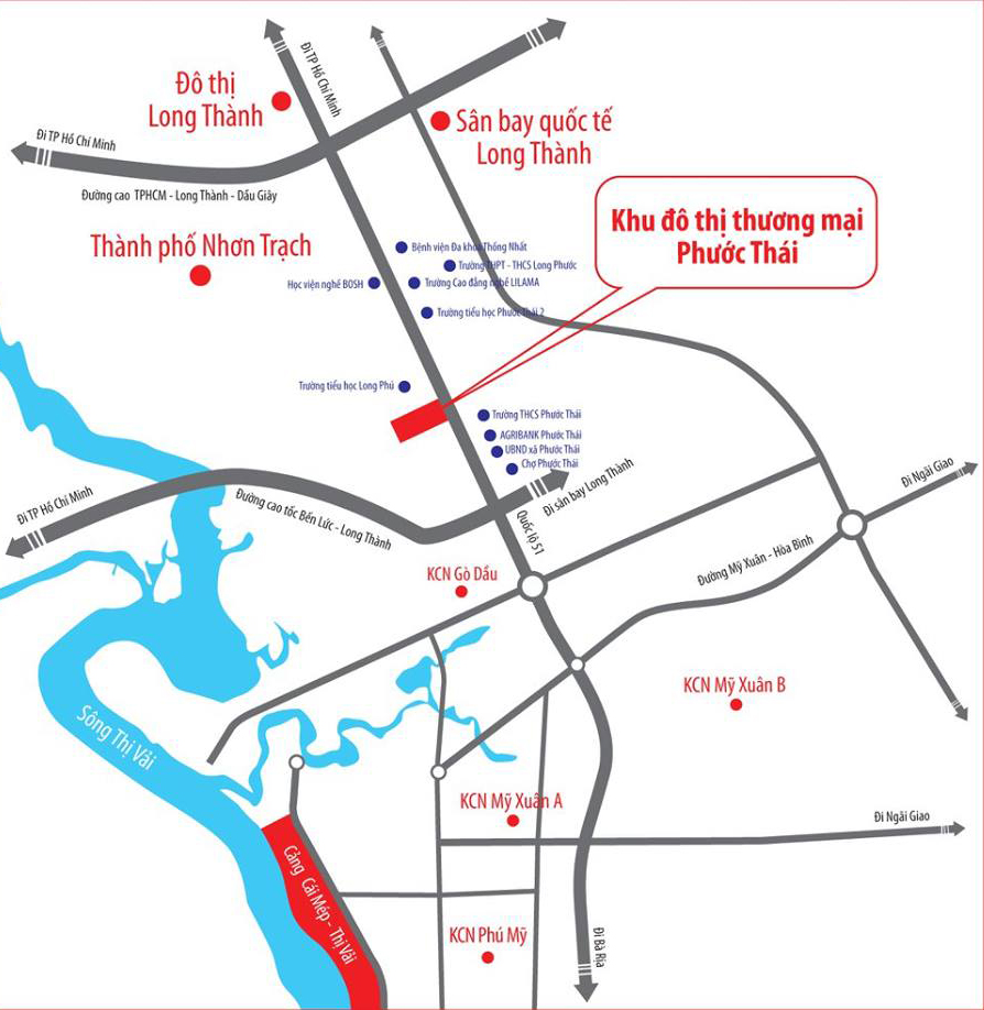 Đặc biệt, khu đô thị thương mại Phước Thái rất giàu tiềm năng gia tăng giá trị do tọa lạc ngay đầu mối giao thông liên vùng với các tuyến đường huyết mạch như quốc lộ 51, đường cao tốc TPHCM - Long Thành - Dầu Giây, đường cao tốc Bến Lức - Long Thành, Tỉnh lộ 25B và 25C…kết nối xuyên suốt đến sân bay quốc tế Long Thành, thành phố Vũng Tàu, thành phố Bà Rịa và các tỉnh miền Tây.